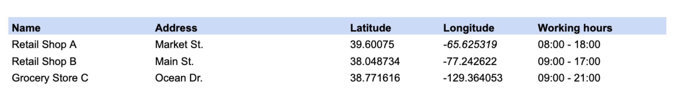 Next, you need to upload a CSV, JSON, or XLSX file with information about the POIs. This file needs to contain the latitude and longitude of each point. Optionally, you can include other relevant information, such as the name, working hours, rent fee, and useful notes.