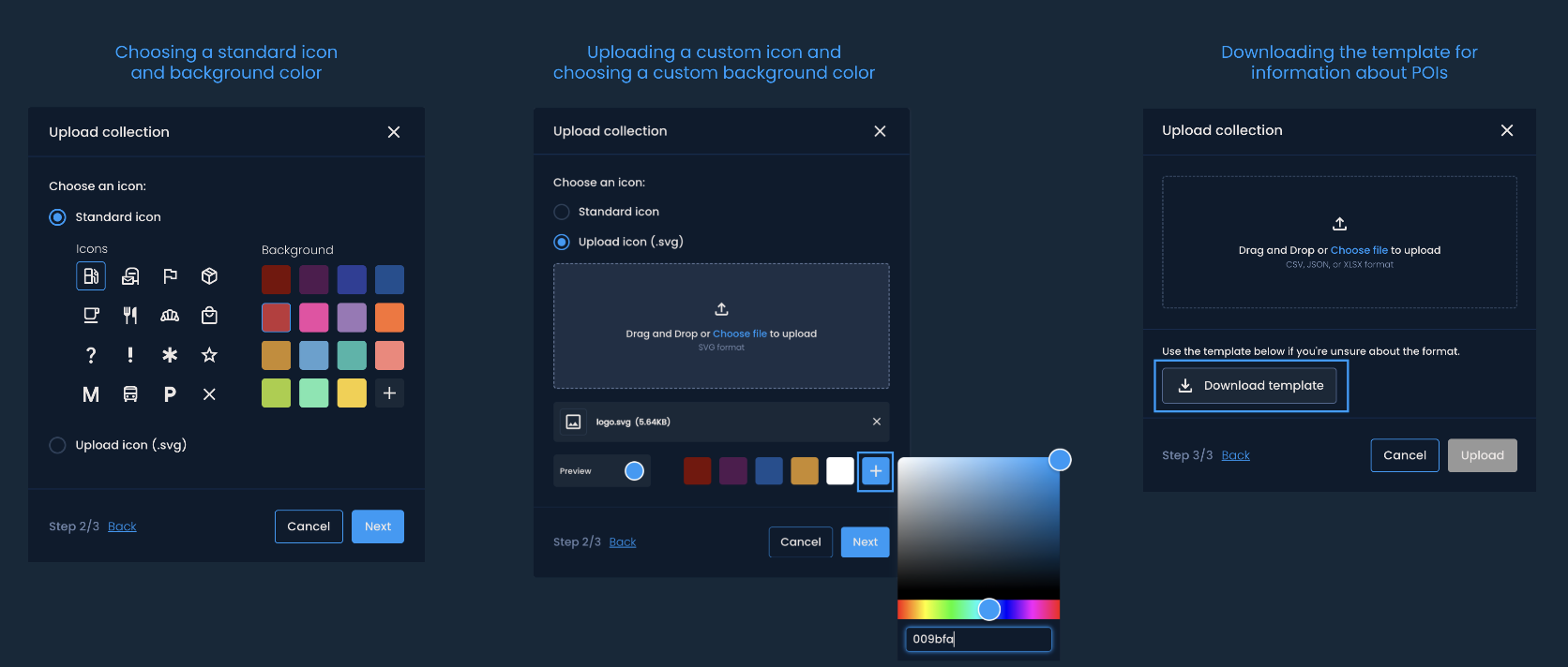 Select an icon to visualize the specific POIs. You can choose one of the standard icons from our library and customize its background color, or you can upload a custom icon (.svg).